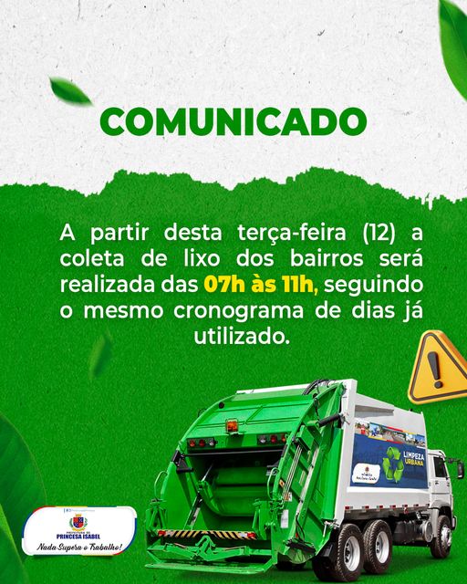 A Secretaria de Infraestrutura, Meio Ambiente e Agricultura comunica a toda população que a coleta de resíduos sólidos dos bairros passa a ser realizada pela manhã, a partir desta terça-feira (12).