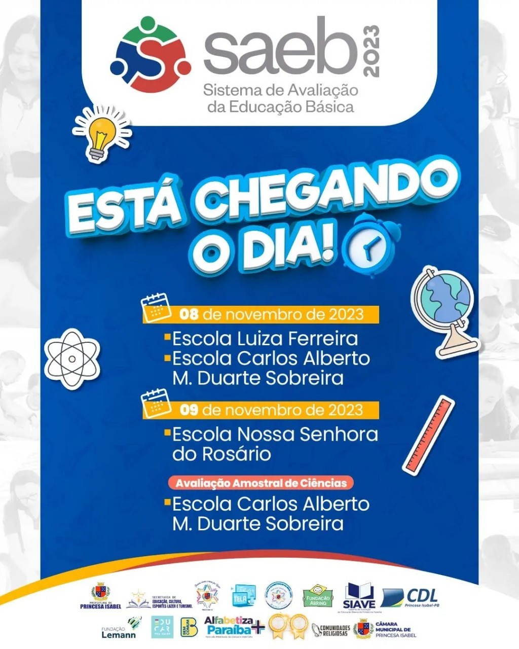 O SAEB - Sistema de Avaliação da Educação Básica - permite que as escolas e as redes municipais e estaduais de ensino avaliem a qualidade da educação oferecida aos estudantes. O resultado da avaliação é um indicativo da qualidade do ensino brasileiro e oferece subsídios para a elaboração, o monitoramento e o aprimoramento de políticas educacionais com base em evidências.Aqui em Princesa, as avaliações acontecem nos dias 08 e 09 de novembro, e os nossos alunos já estão muito bem preparados para mais esse desafio.