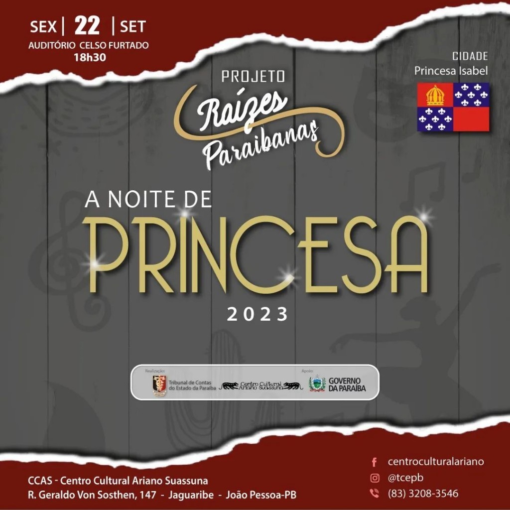 Com o objetivo de evidenciar o potencial dos municípios paraibanos interessados, o Tribunal de Contas do Estado da Paraíba, através do Centro Cultural Ariano Suassuna, lança o Projeto Raízes Paraibanas. O lançamento do projeto será com artistas da cidade de Princesa Isabel no dia 22 de setembro, a partir das 18h. o Centro Cultural Ariano Suassuna está localizado na Rua Professor Geraldo Von Sohsten, 147 - Jaguaribe, João Pessoa – PB.