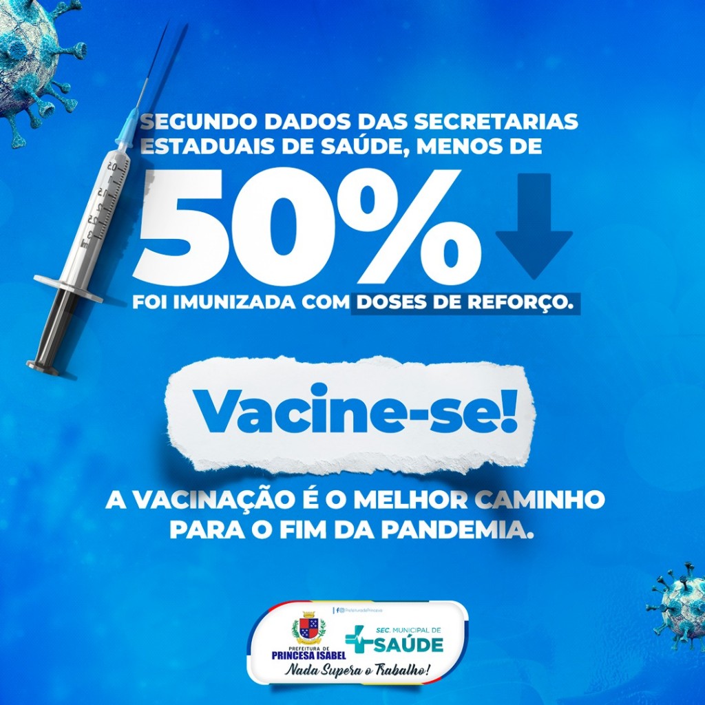84,8% da população brasileira recebeu a primeira dose da vacina contra a covid-19, mas, segundo dados das secretarias estaduais de saúde, menos de 50% foi imunizada com doses de reforço. Vacine-se! A vacinação é o melhor caminho para o fim da pandemia.