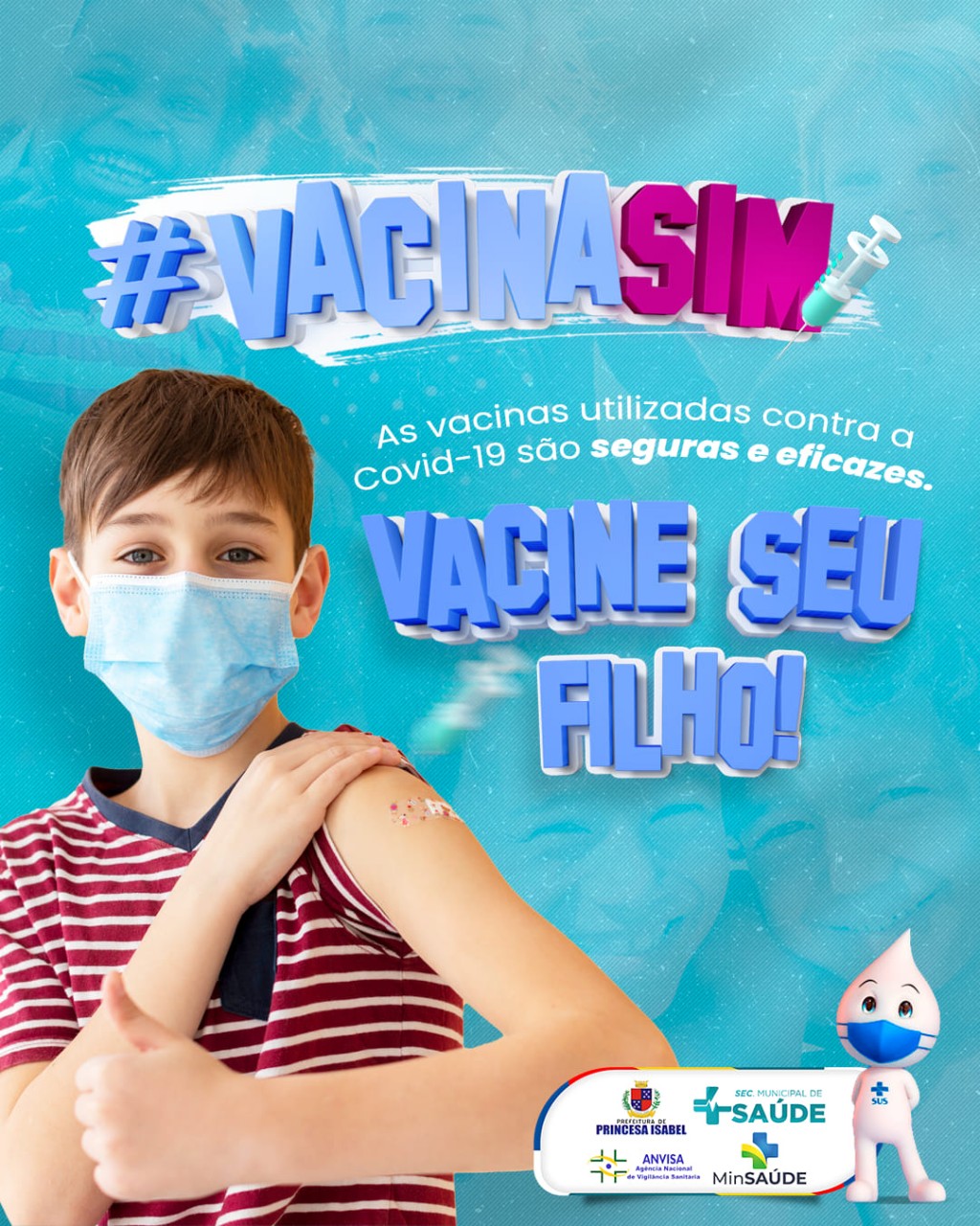 A vacinação contra a Covid-19 para crianças de 5 a 11 anos de idade está chegando. As vacinas são aprovadas pela ANVISA e notadamente eficazes! Em breve, será divulgado o calendário e local. Vacine seu filho!