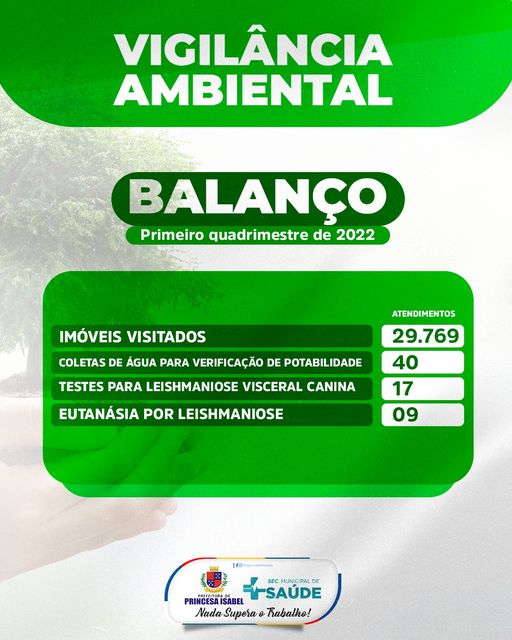As Vigilâncias em Saúde do município de Princesa Isabel seguem realizando um trabalho bastante significativo. A Vigilância Ambiental, por exemplo, somente nos quatro primeiros meses do ano, realizou o total de 29.769 imóveis, com orientações aos moradores e intervenções quando necessário. No mesmo período, foram realizadas 40 coletas de água, que foram enviadas ao LACEN-PB, para verificação da potabilidade; 17 testes de Leishmaniose Visceral Canina e 9 eutanásias, após confirmação do diagnóstico através do teste Elisa no Lacen-PB.